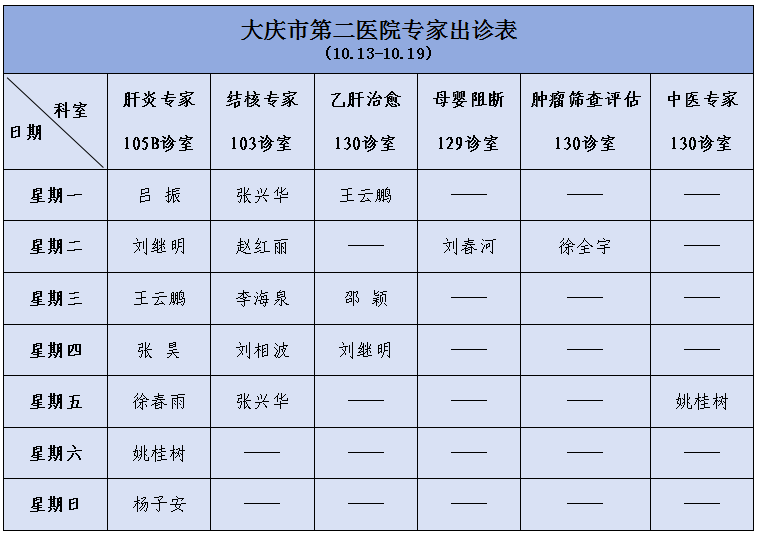 注:周三的乙肝治愈门诊出诊时间为上午,母婴阻断门诊、肿瘤筛查评估门诊出诊时间为每周二上午。