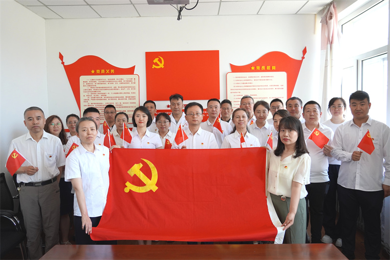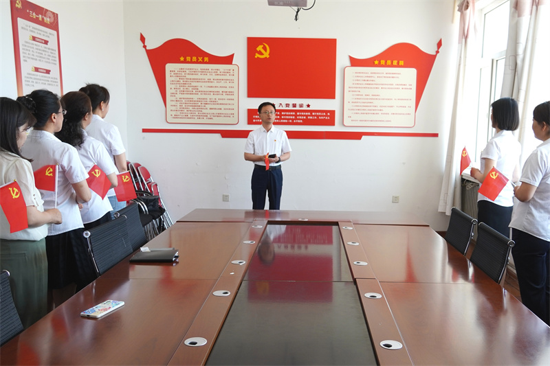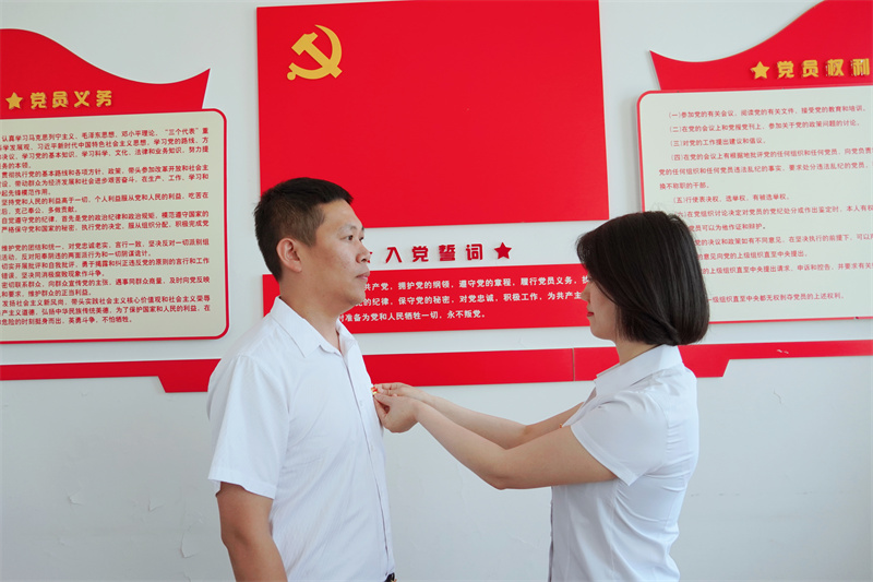 为新党员佩戴党徽。感控联合党支部书记张淑萍严肃地将红灿灿的党徽佩戴在新发展党员孙志龙的胸前,这种精神的传承,是一种荣誉、一种激励、更是一种鞭策。